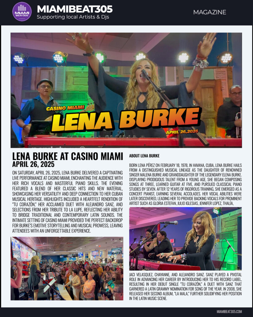 On Saturday, April 26, 2025, Lena Burke delivered a captivating live performance at Casino Miami, enchanting the audience with her rich vocals and masterful piano skills. The evening featured a blend of her classic hits and new material, showcasing her versatility and deep connection to her Cuban musical heritage. Highlights included a heartfelt rendition of “Tu Corazón,” her acclaimed duet with Alejandro Sanz, and selections from her tribute to La Lupe, reflecting her ability to bridge traditional and contemporary Latin sounds. The intimate setting of Casino Miami provided the perfect backdrop for Burke’s emotive storytelling and musical prowess, leaving attendees with an unforgettable experience.